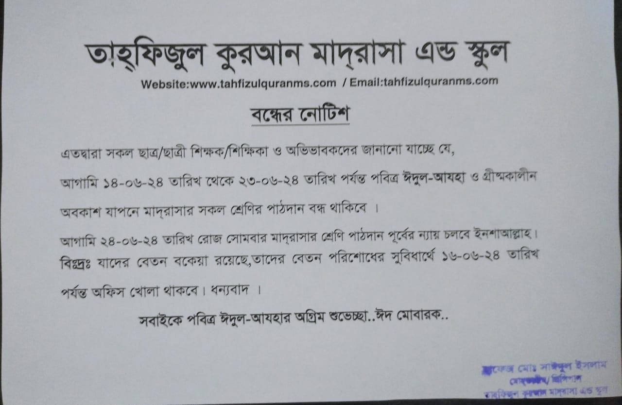 | 3 | পবিত্র ঈদুল আযহা উপলক্ষে আগামী ১৪ /০৬ /২৪ তারিখ থেকে ২৩ / ০৬ /২৪ তারিখ পর্যন্ত মাদরাসার সকল শ্রেণির পাঠদান বন্ধ থাকিবে। |